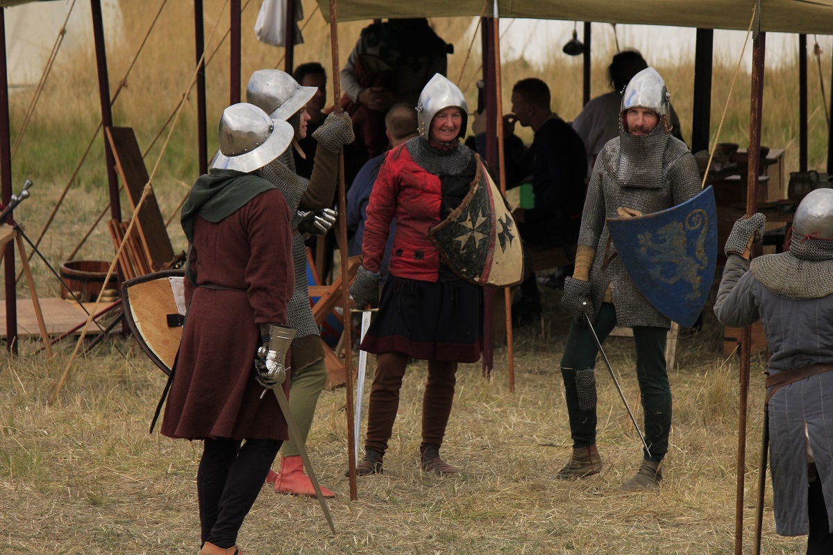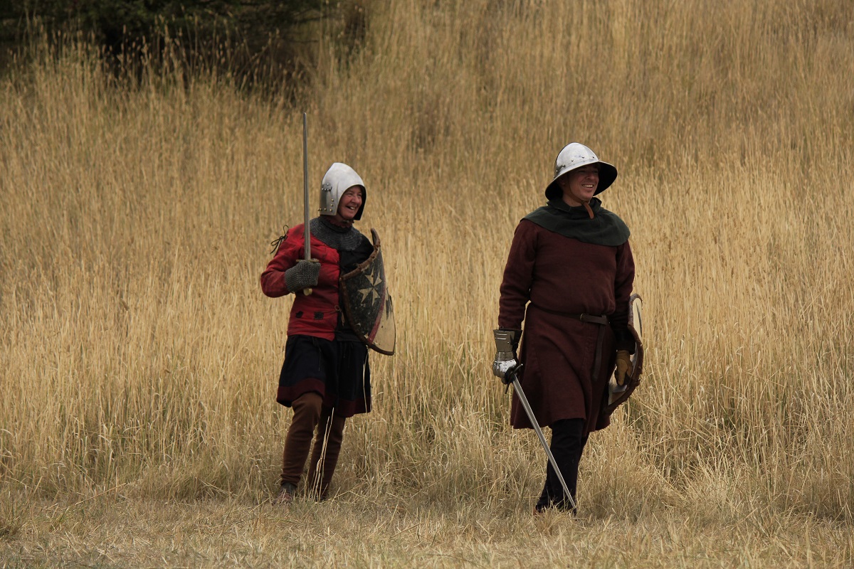 I did manage to partially refurbish a dodgy bascinet before the event, so I could use it with a borrowed arming cap, and someone lent me a heather shield for the group foot combat. My old gambeson, a standard, borrowed maille mittens and off I went. It was my first time being involved in this and it was really quite good fun. I was killed so many times…