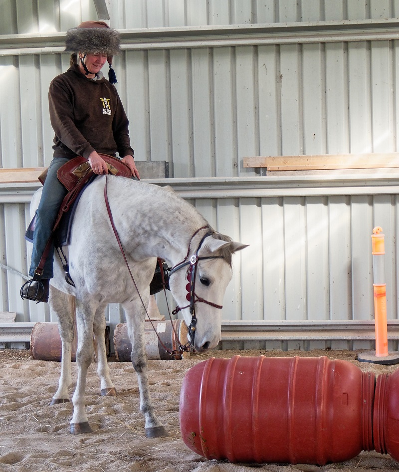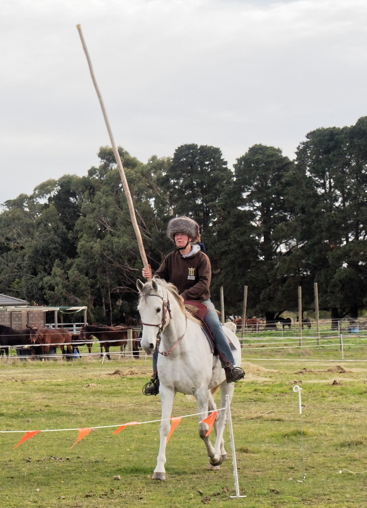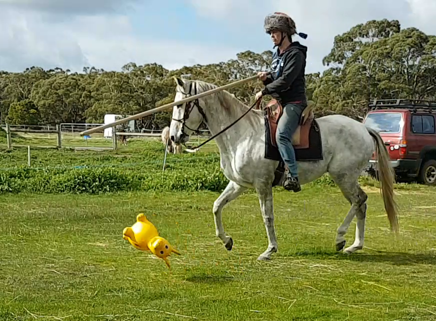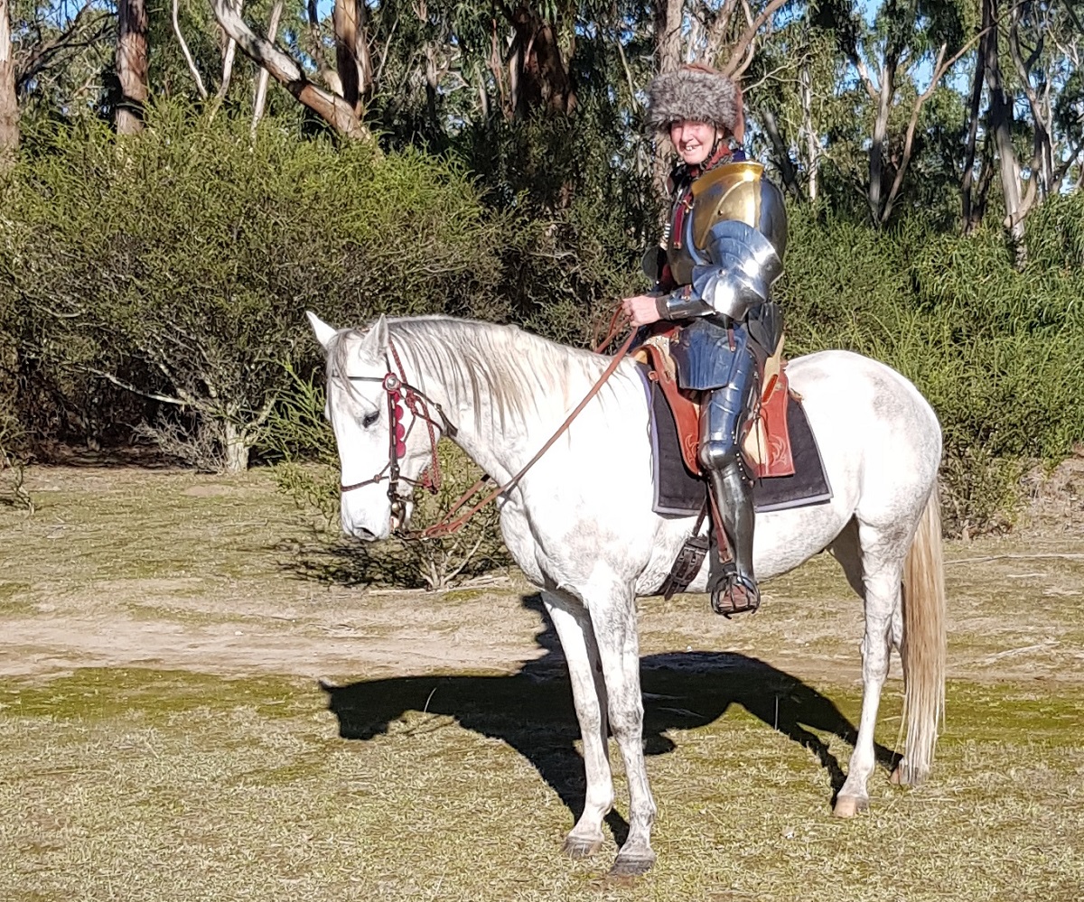 He has done quite a few trail rides, including some in steep and rough country. He has learned about armour and weapons and we have been practicing passes. He is already super at quintain runs. In addition, he enjoys fun group sessions where we play not just with weapons, but with giant inflateable dinosaurs and unicorns. He has also picked up the basics of Spanish walk. I am looking forward to joust training in the near future, but I am progressing his dressage work, where we are already up to shoulder in and working towards travers.